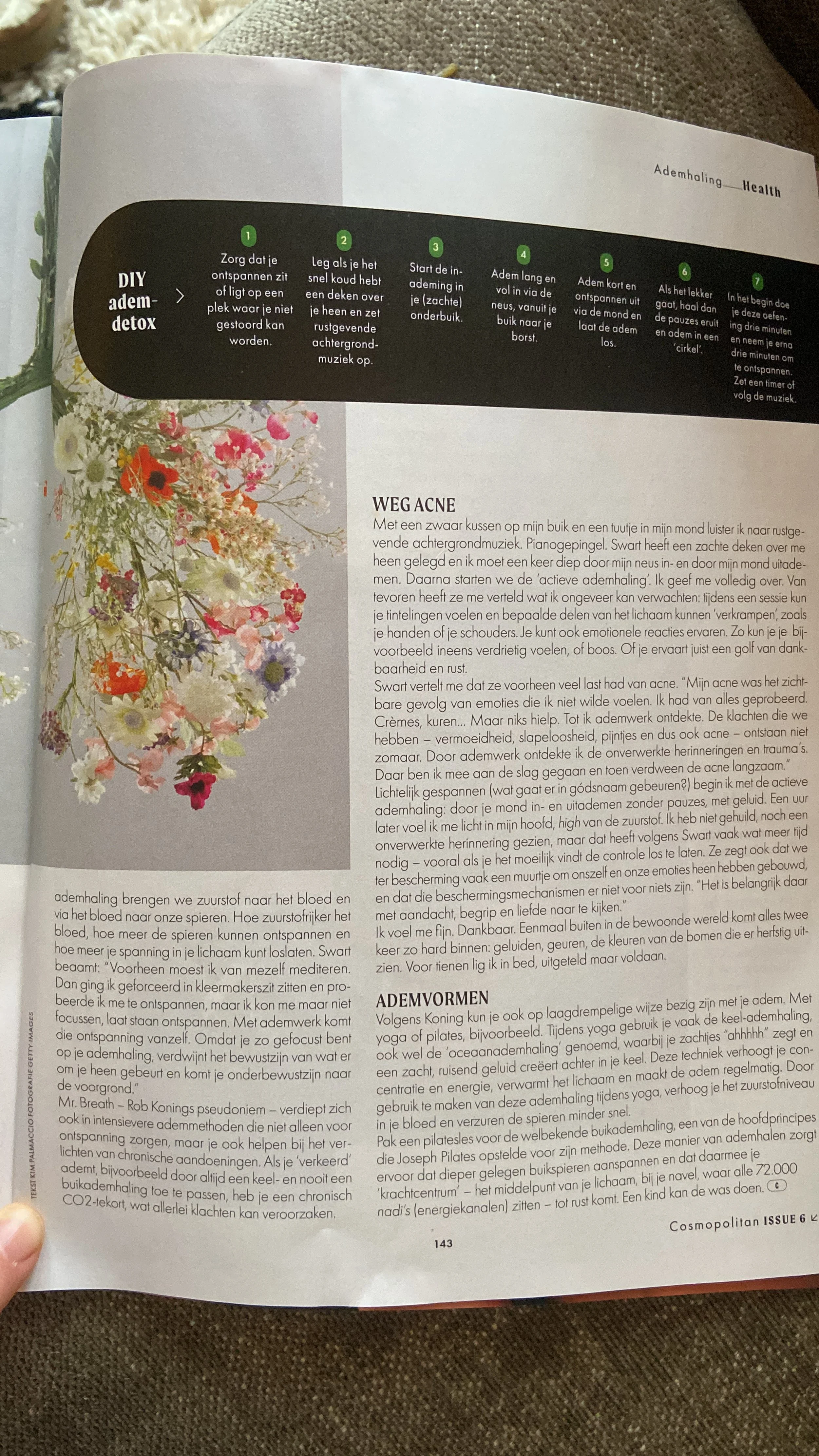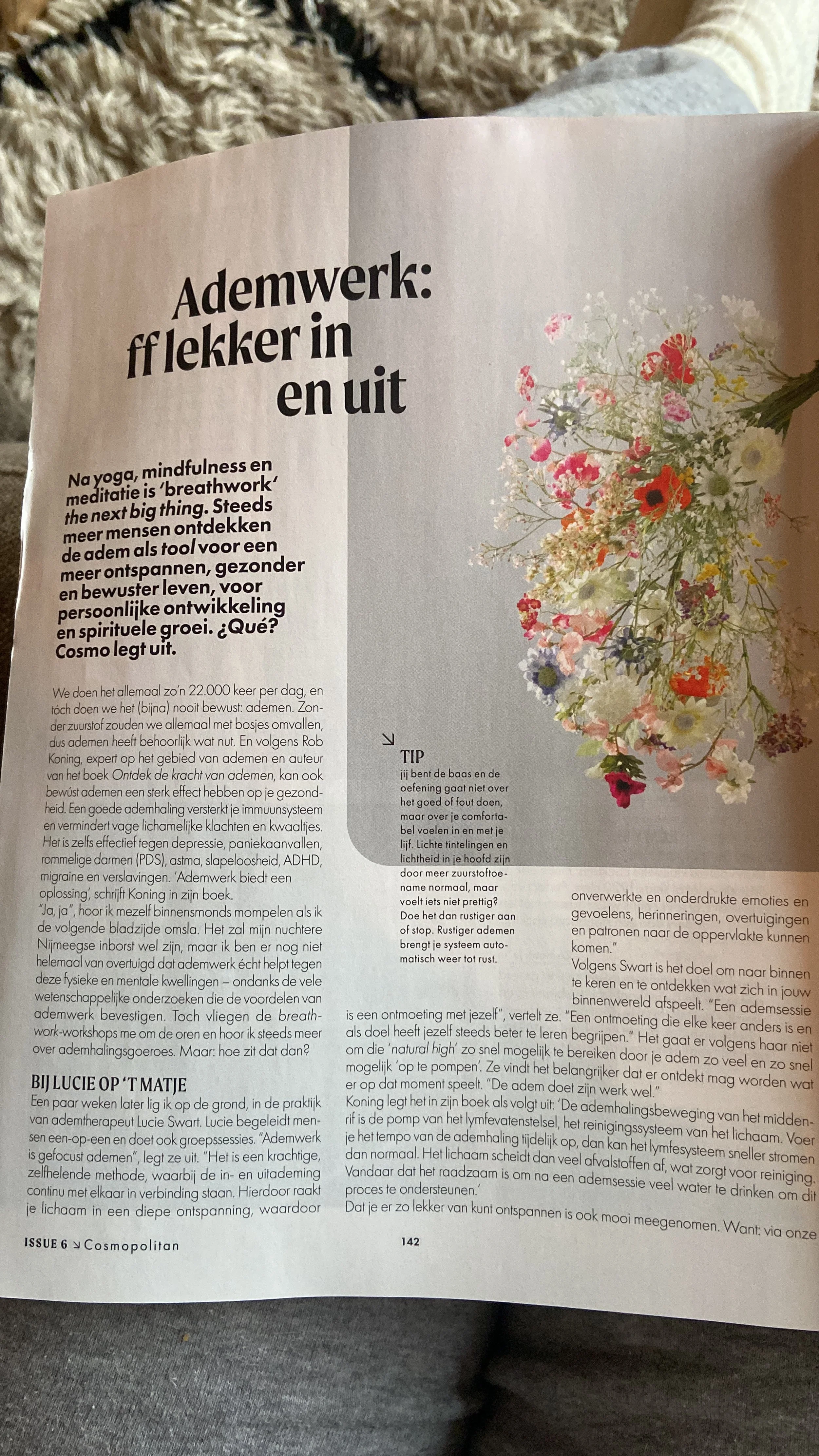 Afgelopen oktober (2022) kwam Kim Palmaccio voor een artikel in de Cosmopolitan langs voor een ademsessie in m’n praktijk. Zo bijzonder dat ademwerk steeds bekender wordt en dat meer en meer mensen het aan het ervaren zijn! Dat maakt mijn ‘ademhart’ super blij ;-) Het was voor Kim de eerste ademsessie ooit! Dankbaar dat ze haar eerste sessie bij mij in de praktijk ervaren heeft. Hieronder lees je het hele artikel… Laat vooral in de comments weten wat je ervan vindt!